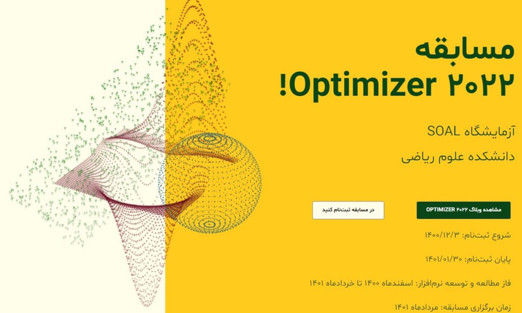 فراخوان ثبت نام مسابقه Optimizer 2022 فراخوان ثبت نام مسابقه Optimizer 2022 که در دانشکده علوم ریاضی دانشگاه صنعتی شریف برگزار می گردد منتشر شد. برای آگاهی از مهلت ثبت نام و توضیحات بیشتر به صفحه ی...