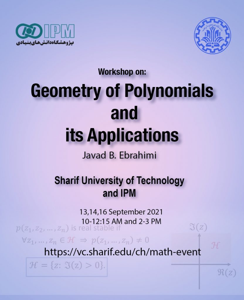 برگزاری کارگاه آموزشی هندسه چندجملهایها ۲۲، ۲۳ و ۲۵ شهریور کارگاه مشترک هندسه چندجملهایها با همکاری دانشکده علوم ریاضی و پژوهشگاه دانشهای بنیادی در روزهای ۲۲، ۲۳ و ۲۵ شهریورماه در اتاق مجازی...